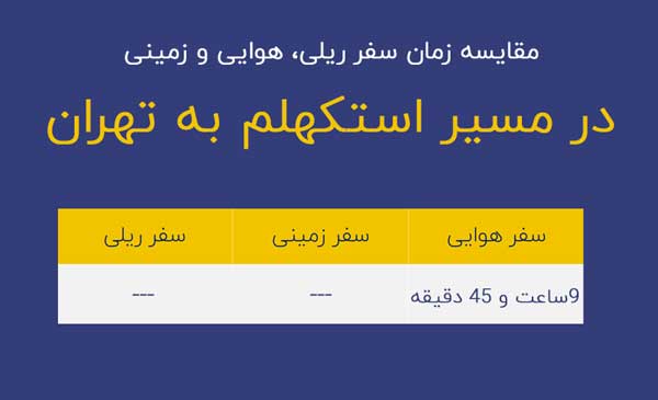 - مدت زمان پرواز استکهلم تهران چقدر است؟ حدوداً 5 تا 6 ساعت بسته به نوع پرواز و مسیر.